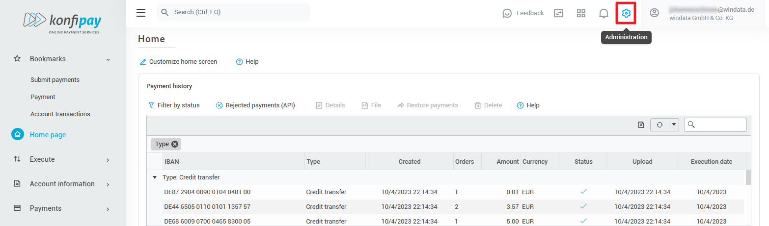 You can find relevant data on your main client on the start page of the admin area. You can get there by clicking on the cogwheel at the top right of your e-mail address: